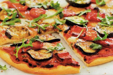 Warzywa umyj i osusz. Paprykę pokrój w paski, cukinię lub bakłażan w plastry. Wymieszaj oliwę z posiekanym czosnkiem i ziołami i natrzyj warzywa, posyp solą i pieprzem. Odstaw na 15 min, potem upiecz na grillu. Ciasto podpiecz 10 min, obłóż warzywami i piecz jeszcze 5 min.