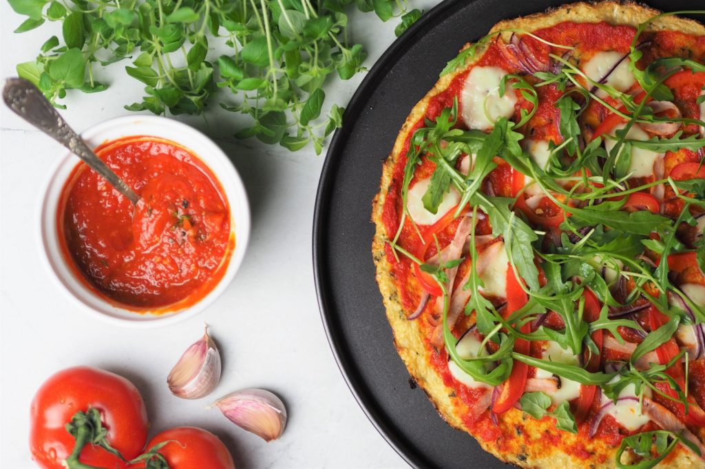 Kalafior ścieramy na tarce o grubszych oczkach albo mielimy w malakserze. Powinien mieć konsystencją ryżu. Przez około 5-6 minut prażymy go na suchej patelni, aby pozbawić go nadmiaru wody. Studzimy. W osobnym naczyniu rozbijamy jajko i dodajemy drobno starty ser oraz oregano. Dokładnie łączymy z przestudzonym kalafiorem. Masę wykładamy na blaszkę wyłożoną papierem do pieczenia (papier warto posmarować cienką warstwą oliwy). Rozsmarowujemy równomiernie na kształt koła. Wstawiamy do piekarnika rozgrzanego do temperatury 200 st. C na około 10-12 minut. Po tym czasie wyjmujemy placek z pieca. Smarujemy go sosem i układamy dodatki. Wstawiamy do piekarnika na kolejne 10 minut. Gotowa pizzę posypujemy rukolą i listkami oregano.
